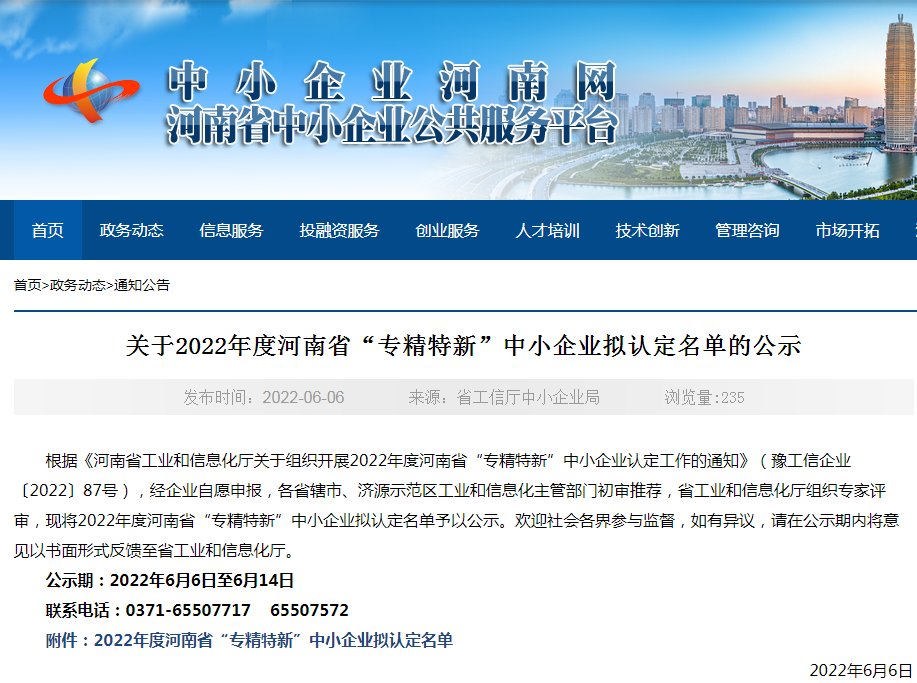 近日,河南省中小企業(yè)公共服務平臺對2022年度河南省“專精特新”中小企業(yè)擬認定名單進行公示。