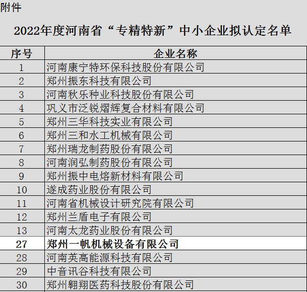 根據《河南省工業(yè)和信息化廳關于組織開展2022年度河南省“專精特新”中小企業(yè)認定工作的通知》,經企業(yè)自愿申報,各地工業(yè)和信息化主管部門初審推薦,省工業(yè)和信息化廳組織專家評審認定,鄭州一帆機械設備有限公司憑借專業(yè)的技術與研發(fā)能力成功入選2022年度河南省“專精特新”企業(yè)名單。